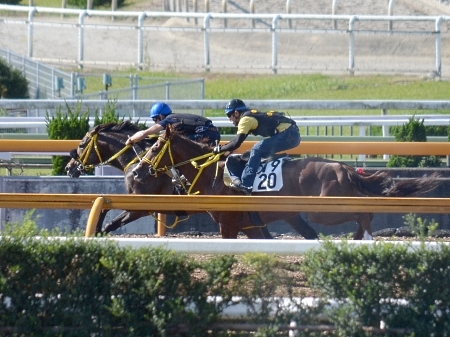 浜中騎手が跨って京都大賞典の最終追い切りを行ったサウンズオブアース(奥、撮影:井内利彰)