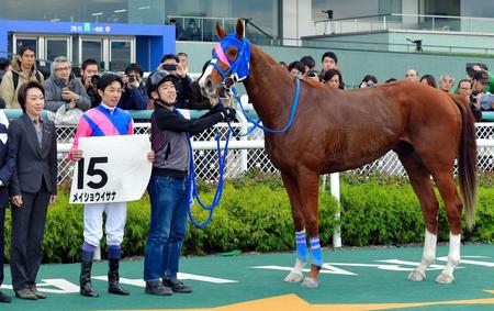 初陣を飾ったメイショウイサナと口取りに並ぶ橋本聖子氏(左)