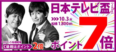 「日本テレビ盃キャンペーン」は、10月3日(水)に行われる日本テレビ盃のポイントが「7倍」、さらに、10月1日(月)〜10月5日(金)の船橋競馬で行われる全てのC級戦を対象にポイントが「2倍」になるお得なキャンペーンです。