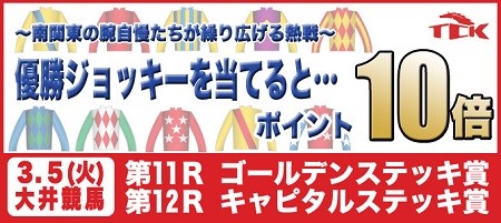 ゴールデンステッキ賞(第11R)」「キャピタルステッキ賞(第12R)」を対象に、ポイントがそれぞれ最大10倍になる「リーディングジョッキーキャンペーン」を実施致します!