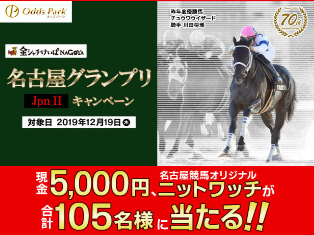2019年12月19日(木)に開催される名古屋競馬の勝馬投票券(重勝式を除く)をオッズパークで合計5,000円以上購入し、本キャンペーンにご応募いただくこと