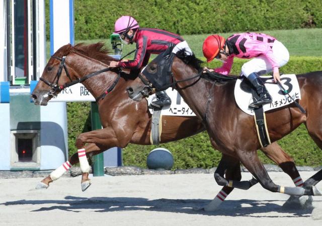 <阪神4R>ハチメンロッピ(3)に半馬身差をつけデビュー戦に勝利したヘニータイフーン(奥)(撮影・奥 調)