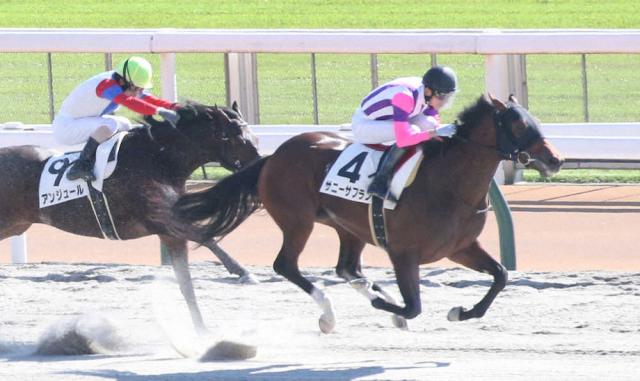 新馬戦を制した坂井騎乗のサニーサフラン(右)(撮影・西川祐介)