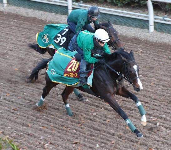 坂路にて併せ馬で追い切るムーンプローブ(手前)(撮影・亀井直樹)