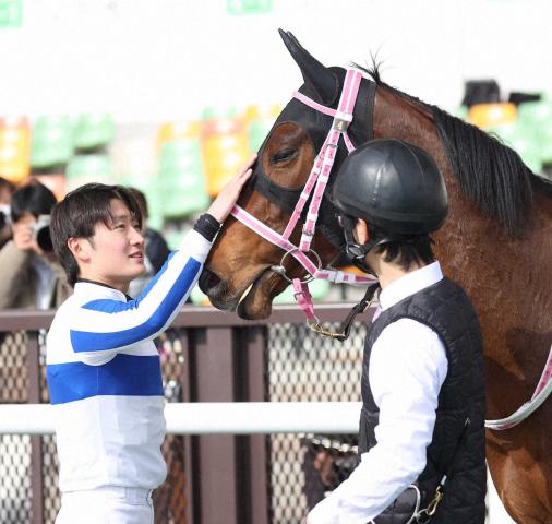 <中京3R>新馬戦を快勝し、スクルプトーリスを撫でる鮫島駿(左)(撮影・平嶋 理子)