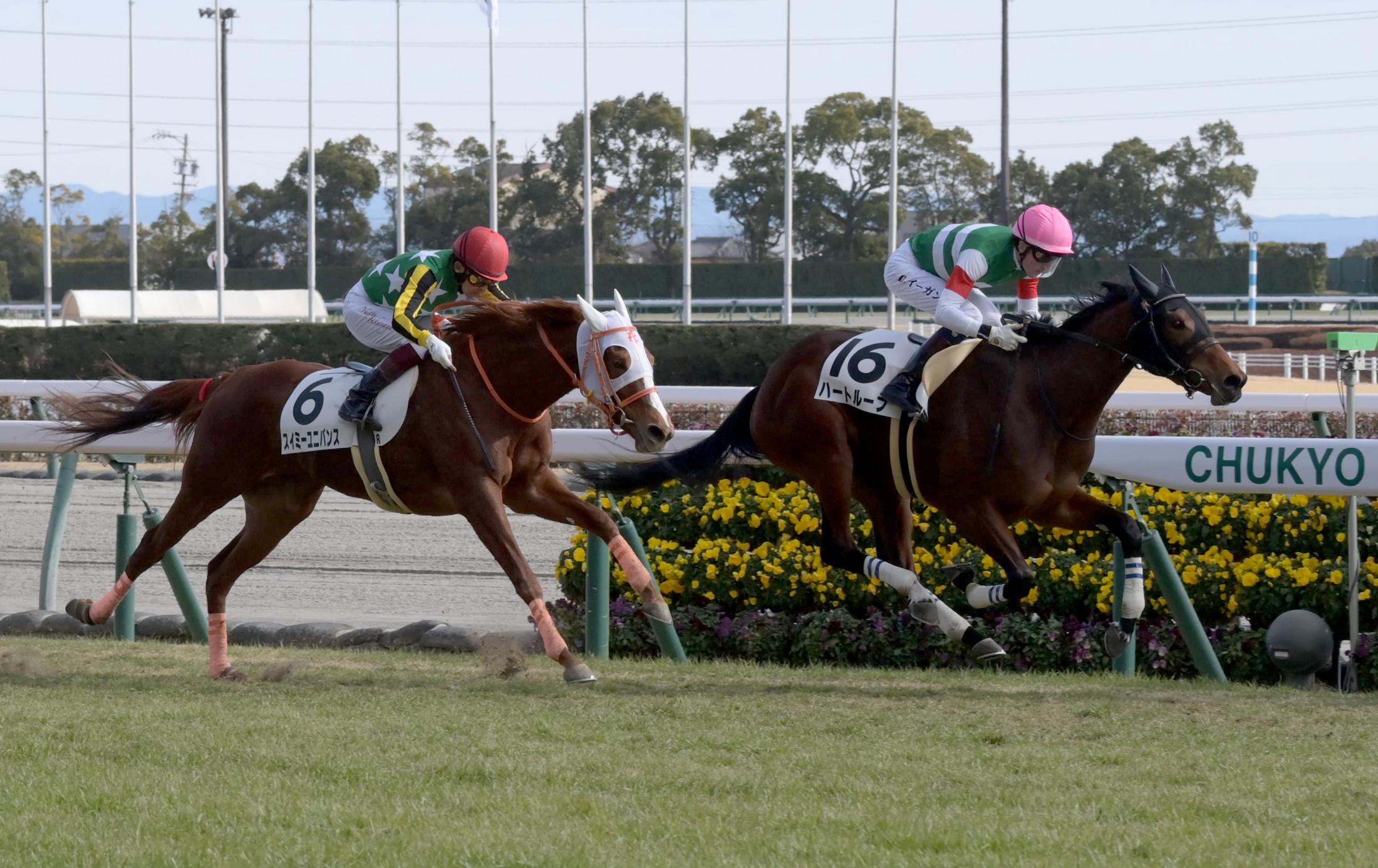 メイクデビュー中京を制したイーガン騎乗のハートループ(右)