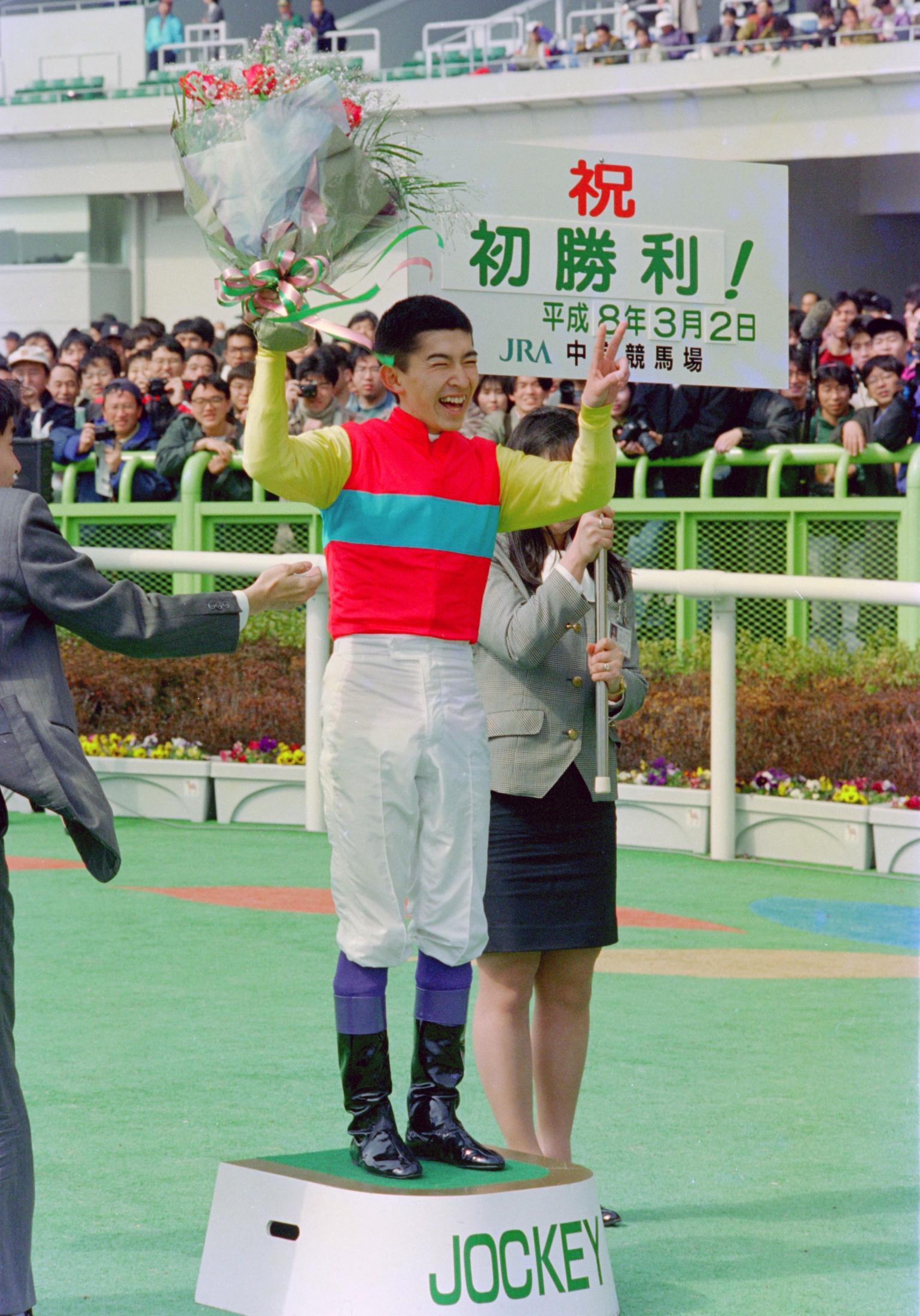 初勝利に満面の笑みを見せる福永=1996年3月2日・中京競馬場