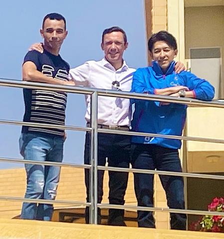 サウジカップデーの公式会見に出席した福永祐一騎手(右)はデットーリ騎手(中)、モレイラ騎手と再会。並んで記念撮影におさまった