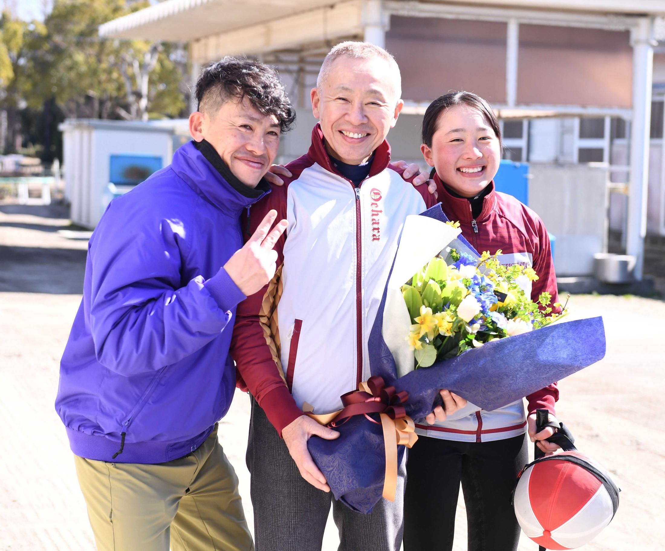 長男の勝さんは蛯名正厩舎の調教助手で、その娘の比呂さんはJRA競馬学校に入り、騎手を目指している。「比呂は無事なら来年3月にデビューするから。楽しみだね。その時は競馬場に来るよ」。厩舎実習中の愛孫に花束を渡され、満面の笑みが咲いていた。(デイリースポーツ・刀根善郎)