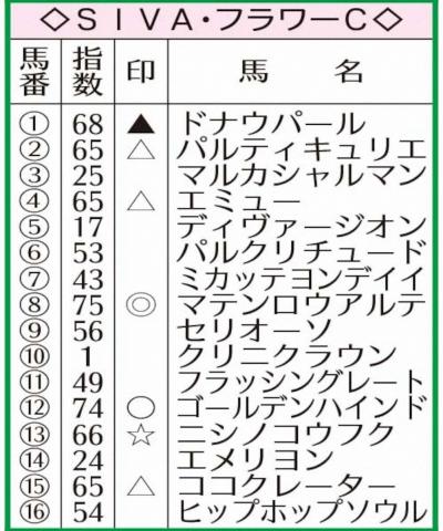 本日は中山11R・フラワーCを取り上げる。指数1位(75)で◎に指名されたのは(8)