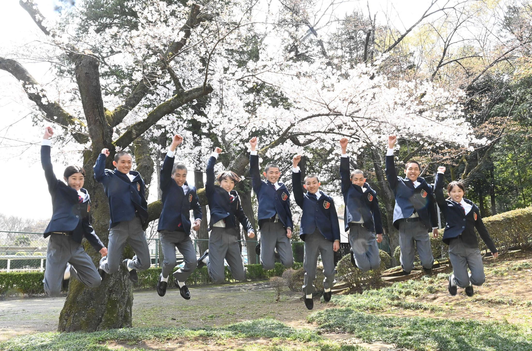 桜の下でジャンプする(左から)萱野花音さん、川原謙心君、竹島英騎君、田中美海さん、谷原圭大君、千引陸君、藤田悠輔君、幸大斗君、山田仁菜さん