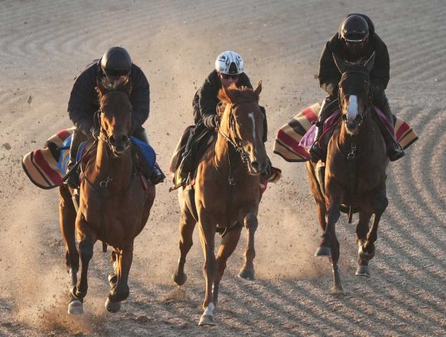ウッドチップコース、3頭併せで追い切るレッドキングリー(中)=撮影・郡司 修