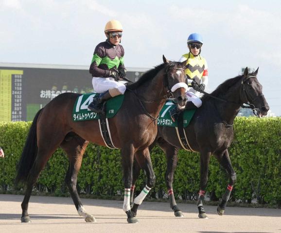 <中山11R京成杯AH>14着でレースを終えた柴田善騎乗のタイムトゥヘヴン(左)と3着でレースを終えた丸山騎乗のコントラポスト(撮影・郡司 修)