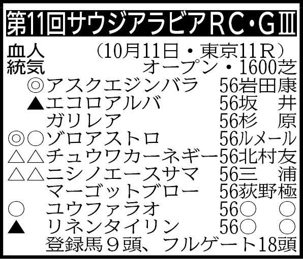 アスクエジンバラ。1週前追い切りは、栗東CWの併せ馬で6F82秒6-11秒7をマークし、年長馬相手に0秒5先着。動きの良さが目立っており、状態は文句なし。攻め通りなら3連勝でのタイトル奪取が濃厚だ。