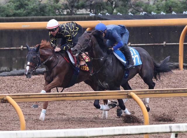 Cウッドをカエルム(右)と併せ馬で追い切るセナスタイル