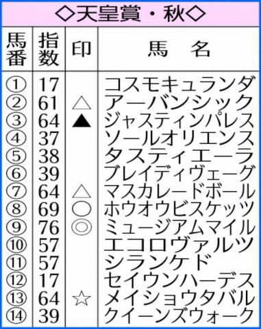 今年の天皇賞・秋は出走各馬の実力が接近。激戦必至の情勢だが、AIが白羽の矢を立てたのは(9)