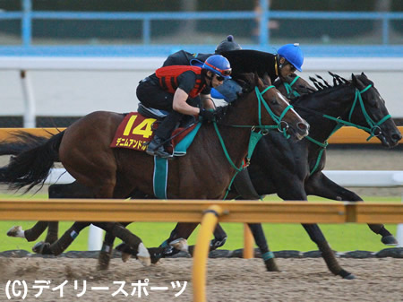 栗東CWで内田博を背に追い切るデニムアンドルビー(手前)