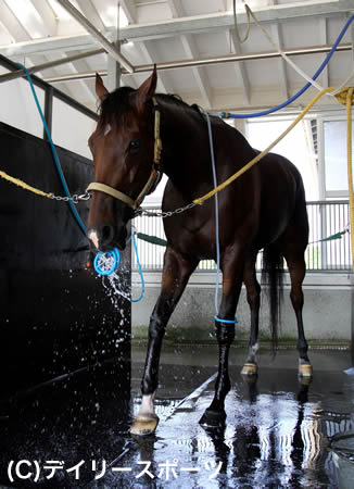 運動を終えて洗い場でリラックスするメイショウイザヨイ